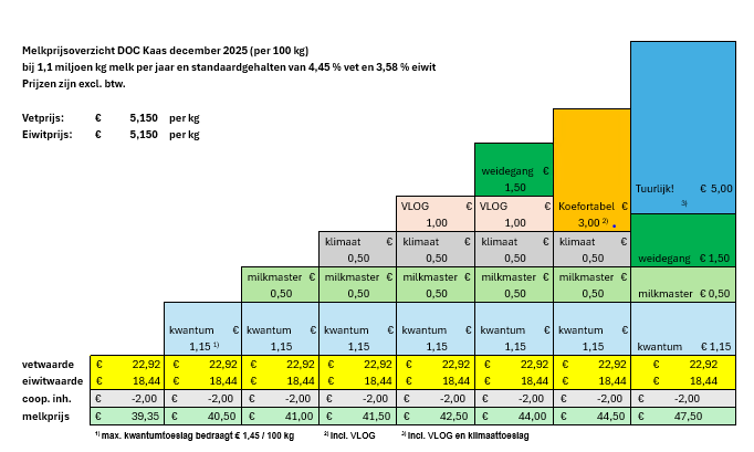 Bekendmaking voorschotmelkprijs december 2025 Home / Actueel / DOC Kaas U.A. / Bekendmaking voorschotmelkprijs december 2025 Melkprijs december 2025 Hoogeveen, 16 december 2025 De maximale melkprijs van DOC Kaas voor de maand december bedraagt € 47,50 per 100 kg bij een jaarleverantie van 1.100.000 kg melk met 4,45% vet en 3,58% eiwit. De melkprijs van december is daarmee € 4,32 per 100 kg gedaald ten opzichte van november. De vet- en eiwitprijs voor december bedraagt € 5,150 per kg.